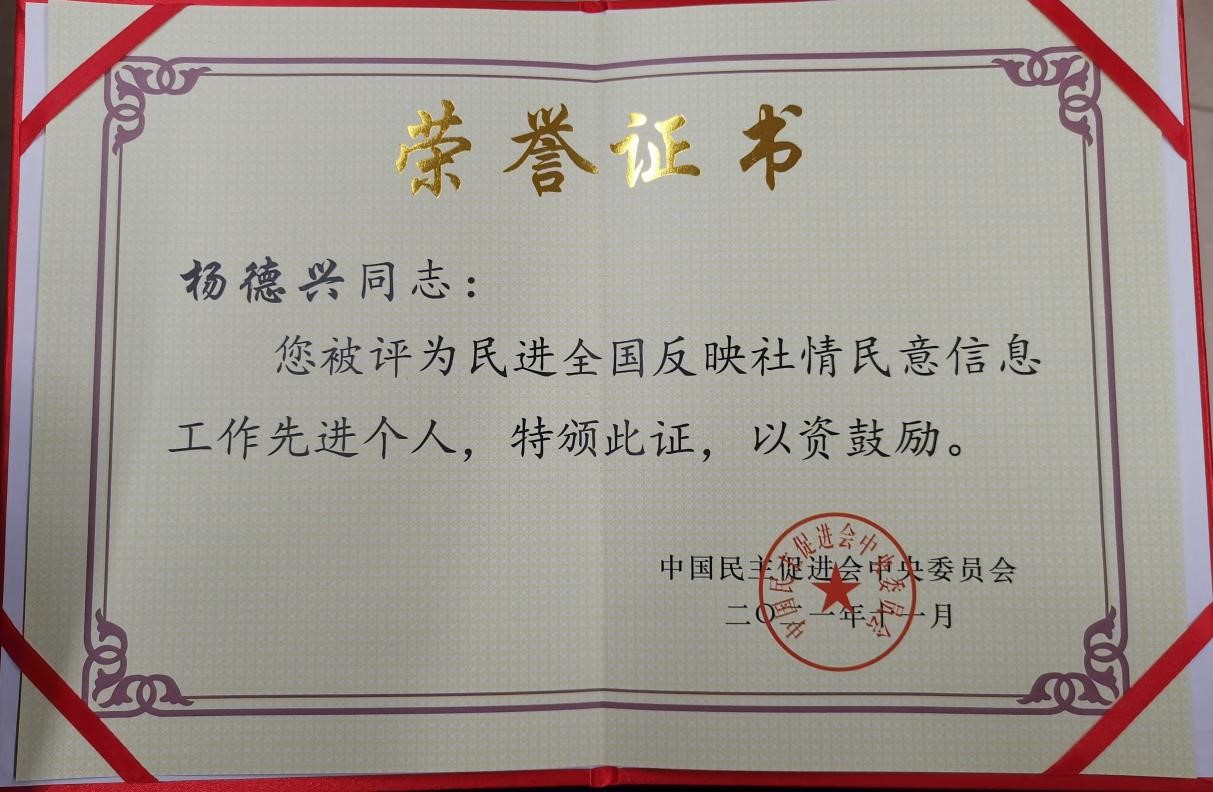2021年是民进中央反映社情民意信息主题年。为树立典型、表彰先进,激励全会各级组织和广大会员进一步做好反映社情民意信息工作,民进中央于12月1日在北京召开反映社情民意信息主题年工作会暨2021年参政议政年会,对今年以来在反映社情民意信息工作中做出突出成绩的先进集体和个人进行了表彰。民进西工大总支主委、赌博网站 教授杨德兴荣获2021年“民进全国反映社情民意信息工作先进个人”。