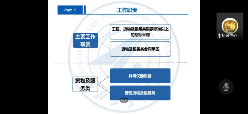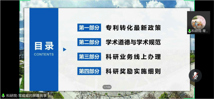 学术道德相关政策制度宣贯》及《科研业务网上办理宣讲》、研究生院《研究生教育政策宣贯》、国际合作处《教职工因公出国(境)政策宣讲》、招标与设备采购中心《货物及服务类合同签审政策及注意事项》、财务处《科研财务政策解读》、发展规划处《“双一流”专项资金申报及管理政策解读》、纪委办公室《案例警示教育》,共同组成了本次宣讲内容,对于相关政策进行了详细的解读。