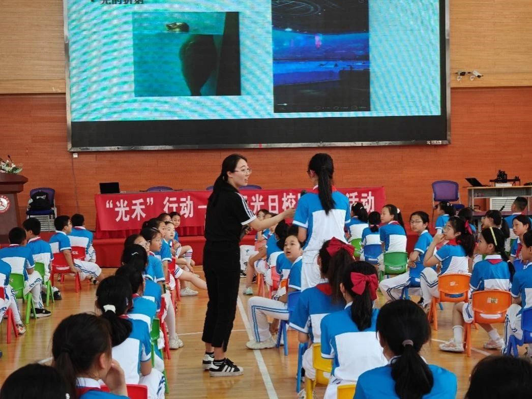 首先进行的是科普小课堂环节,科普队员结合生活中的实例为同学们生动有趣地讲解了光的反射、折射和散射现象,并展示了这些神奇的现象在生活、科研和国防领域的重要应用。