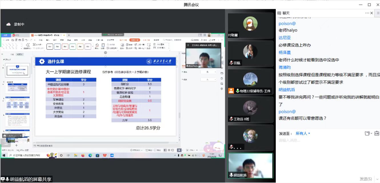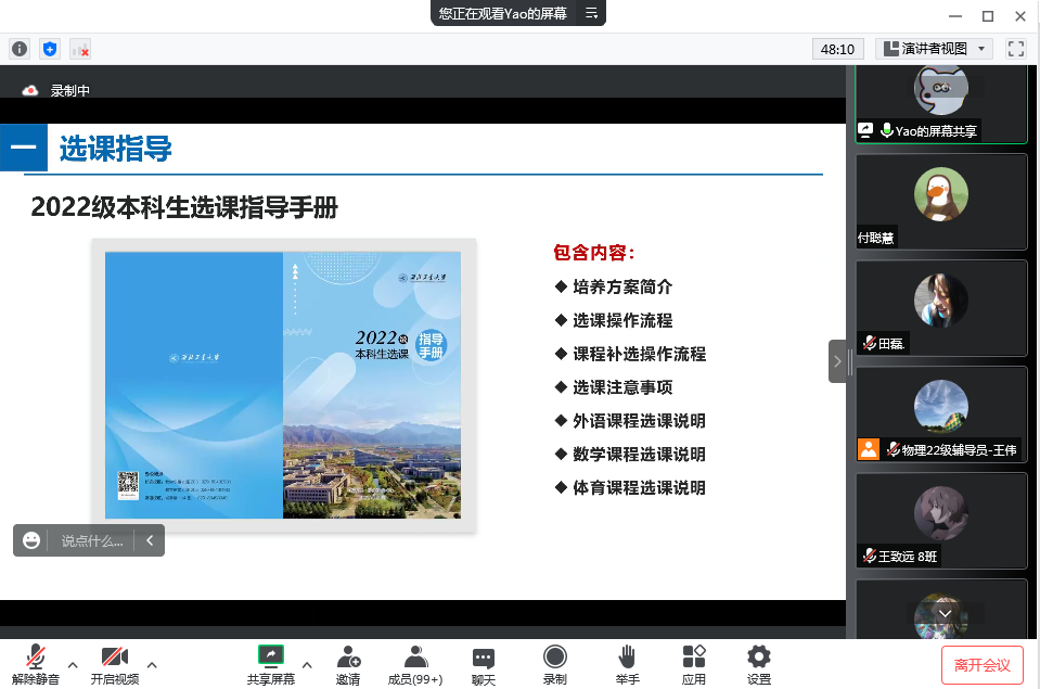 联合教务处学生注册中心,在线上进行了2022级新生选课指导活动,会议活动由2022级辅导员王伟主持。