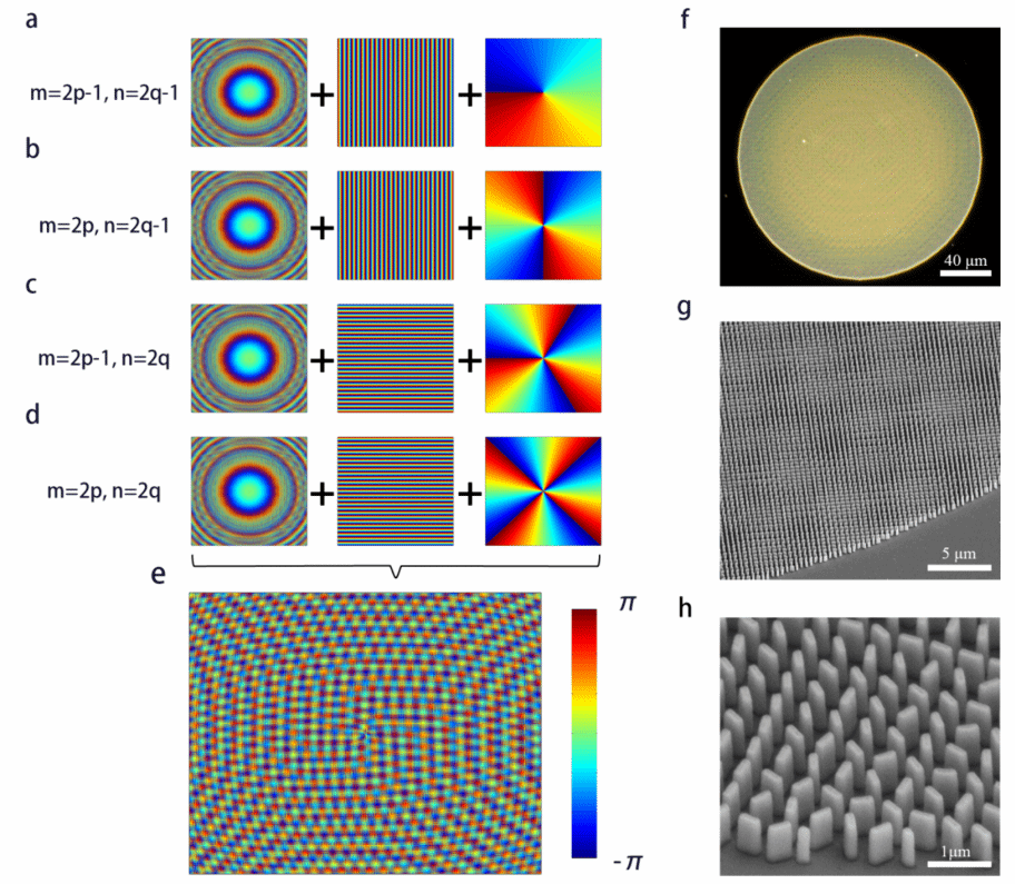 该器件可将入射圆偏振光转换为四个不同拓扑电荷的轨道角动量光束,其核心是采用高深宽比二氧化钛纳米鳍结构,通过控制纳米鳍旋转角度产生几何相位延迟。独特的单元设计将每个单元分为四个独立调控的子区域,最终实现生成拓扑电荷1-4的涡旋光束,这些光束可沿不同方向偏转并在四个焦平面定制聚焦。通过叠加涡旋、透镜和倾斜三种相位,构建出完整的复合相位分布。该器件采用8相位等级调控,超胞周期6.4微米,在200×200微米样品上集成了50万纳米鳍,实现了高精度制备。