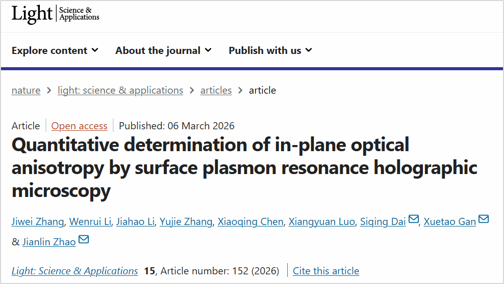 赵建林教授团队在二维材料面内光学各向异性定量测量方面取得重要研究进展,相关研究成果以“Quantitative determination of in-plane optical anisotropy by surface plasmon resonance holographic microscopy”为题发表于光学领域高水平期刊《Light: Science & Applications》(论文链接://www.nature.com/articles/s41377-026-02207-7)。张继巍副教授为论文第一作者,赵建林教授、甘雪涛教授、戴思清副教授为论文共同通讯作者。