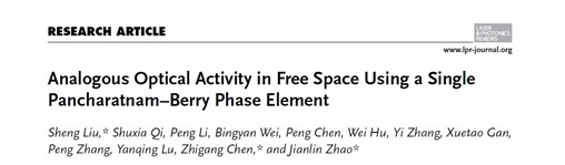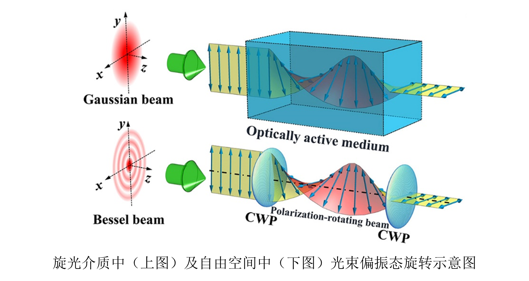 赵建林教授、刘圣副教授团队与南京大学陆延青课题组、南开大学陈志刚课题组合作,突破了这一问题。通过设计的一种具有锥波相位的几何相位元件,实现了贝塞尔光束在自由空间中的旋光效应。该旋光现象与传统磁致旋光现象有许多类比之处,如线性旋转、圆双折射、旋光色散、非互易性等。基于这种旋光效应的类非互易性,可以实现方向相关的偏振旋转器或光隔离器。相关成果以“Analogous Optical Activity in Free Space Using a Single Pancharatnam–Berry Phase Element”为题发表于国际顶级学术期刊《Laser & Photonics Reviews》(DOI: 10.1002/lpor.202100291; IF:13.1)。