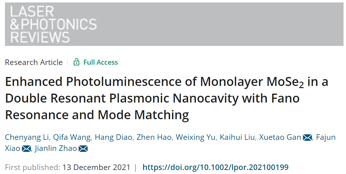 肖发俊、甘雪涛、赵建林教授团队与中科院西安光机所鱼卫星研究员、北京大学刘开辉教授合作,在纳腔增强荧光光谱方面取得重要进展。相关成果以“Enhanced Photoluminescence of Monolayer MoSe2in a Double Resonant Plasmonic Nanocavity with Fano Resonance and Mode Matching”为题发表于光学类国际顶级期刊《Laser & Photonics Reviews》(DOI: 10.1002/lpor.202100199)。赌博网站