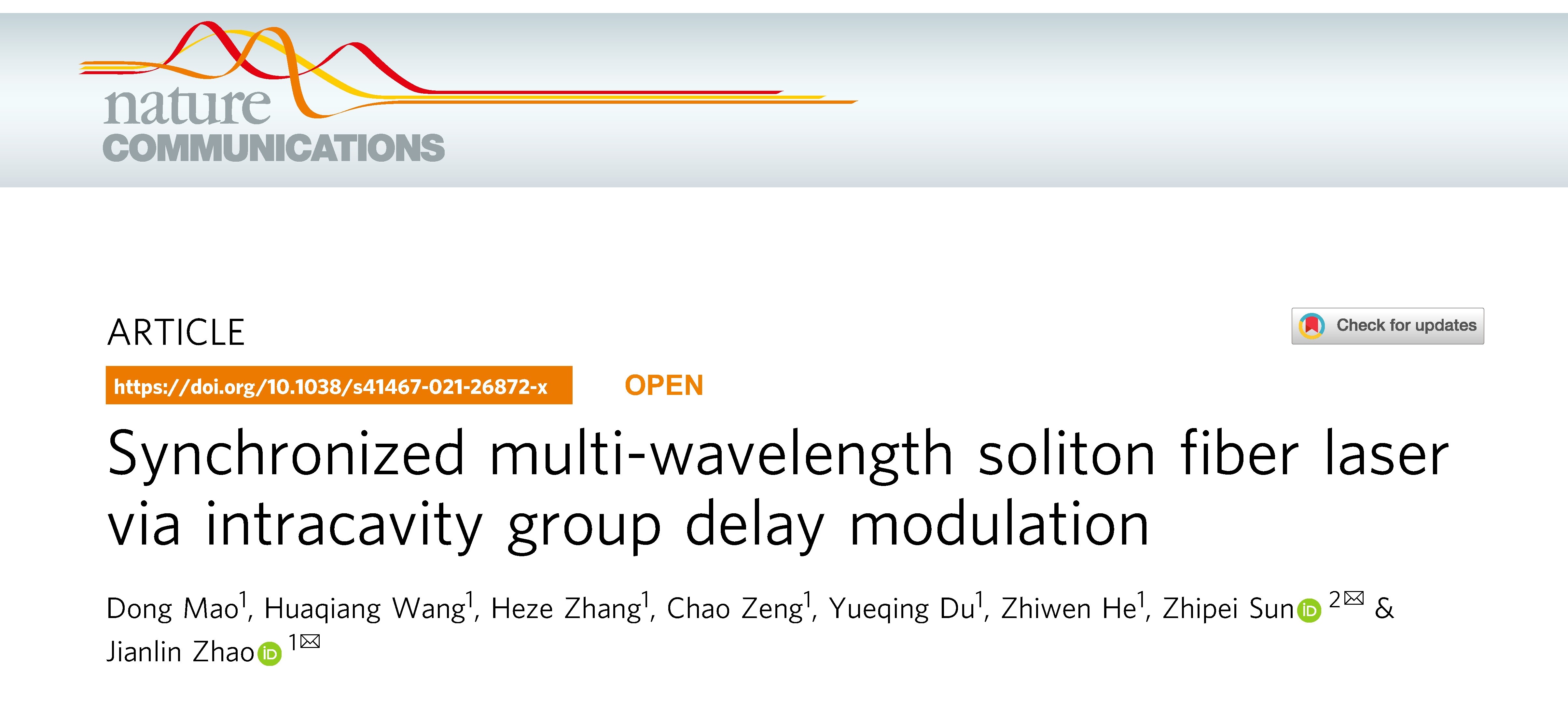 毛东教授、赵建林教授研究团队与芬兰阿尔托大学孙志培教授合作,在多波长同步锁模孤子激光方面取得重要进展。2021年11月18日,相关成果以“Synchronized multi-wavelength soliton fiber laser via intracavity group delay modulation”为题发表在国际顶级学术期刊《Nature Communications》上。论文第一作者为毛东教授,通讯作者为赵建林教授和孙志培教授。论文链接://www.nature.com/articles/s41467-021-26872-x#Sec12