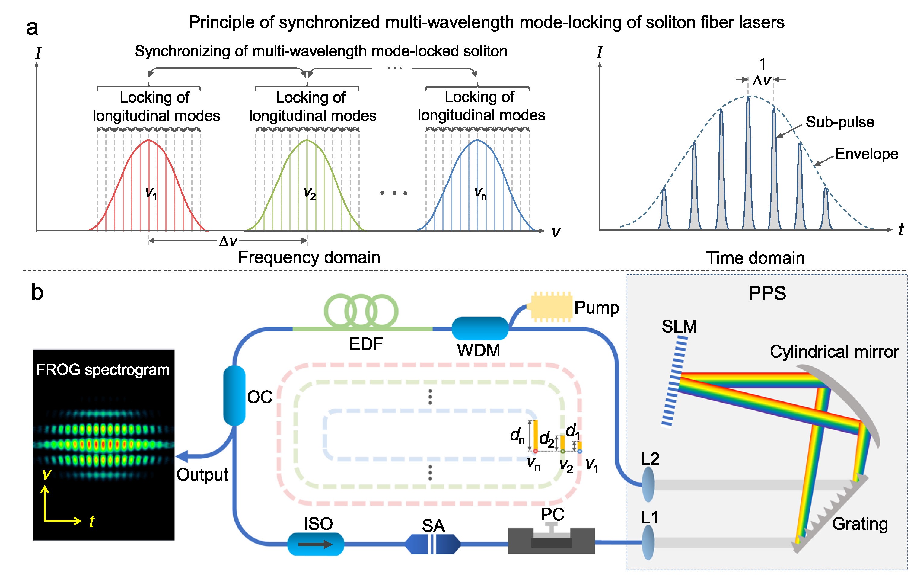 超快光纤激光器利用光纤为传导介质,具有结构紧凑、稳定性好、光束模式优良、峰值功率高以及与其他光纤系统兼容等优点,在高速光通信、生物医学、材料处理和精密物理测量等领域具有广泛的应用。锁定激光谐振腔中的纵模是产生超短脉冲的典型方法。然而,对于传统多波长锁模光纤激光器而言,由于群速度色散的影响,脉冲传输速度与工作波长相关,导致不同波长锁模脉冲在腔内独立演化并周期性碰撞。因此,如何在非零色散光纤谐振腔中产生多波长同步锁模孤子是超快激光领域的难点之一。