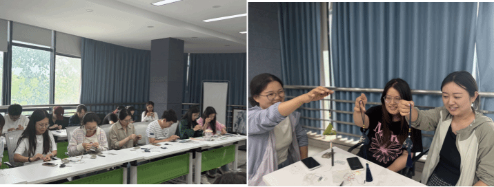 美育部志愿者的协助下,师生们手持银针、穿针引线,按照步骤裁剪布料、缝制袋口,亲手完成端午香囊的制作。整个过程中,师生们感受到古人独具的匠心智慧,体验了传统手工技艺的独特魅力。