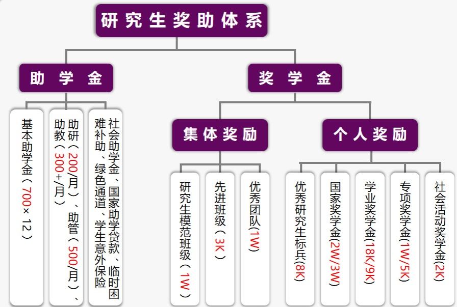 还为品学兼优的研究生提供研究生助教(300+/每月)、助管(500/月)和助研(200/月)等多种实践机会。此外,还包括集体奖励(研究生模范班级1w、先进班级3k、优秀团队1w)和个人奖励(优秀研究生标兵8k、国家奖学金2w/3w、学业奖学金18k/9k、专项奖学金1w/5k、社会活动奖学金2k)类的奖学金。